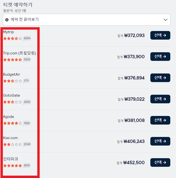 7. 내가 선택한 날짜와 시간대의 항공권 가격을 회사별로 모두 확인하고 가장 마음에 드는 사이트로 이동하셔서 결제하시면 됩니다.