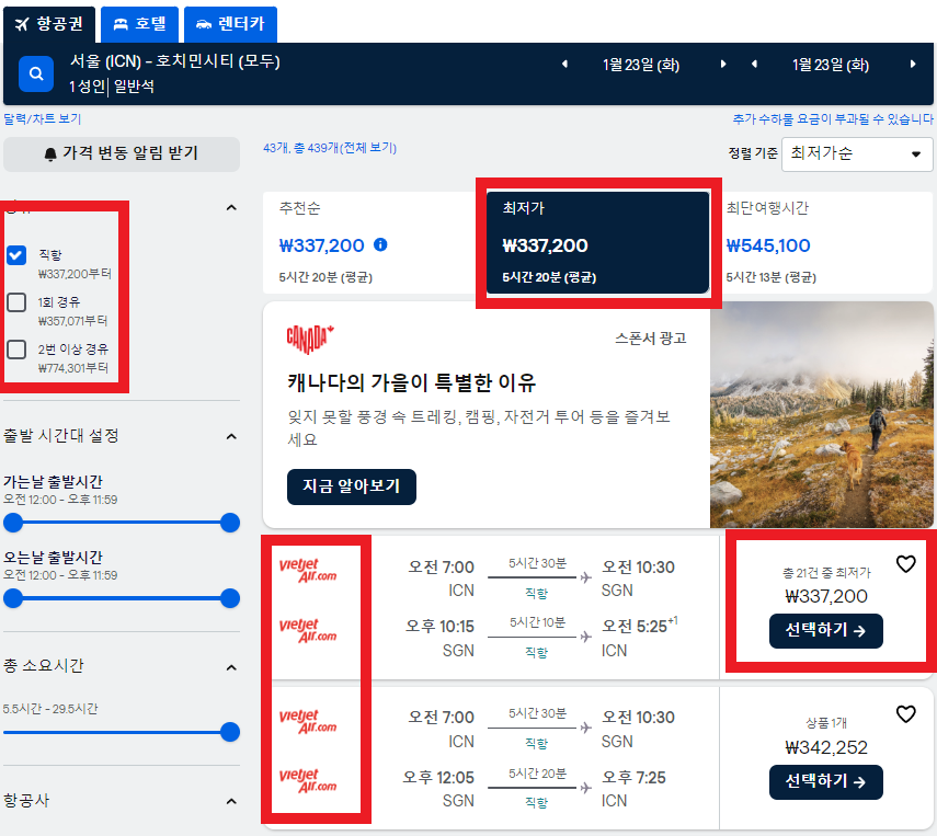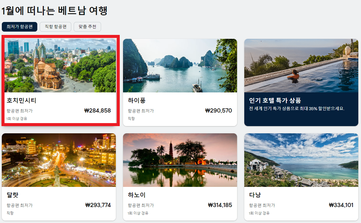 4. 저는 베트남에서 호찌민시티를 선택해 보겠습니다. 1회 이상 경유인지 직항인지를 확인하셔야 합니다.