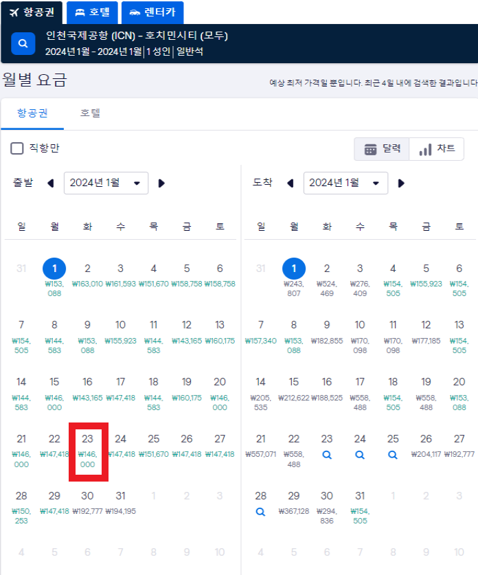 5. 내가 선택한 날짜(월)의 항공권 가격을 확인하실 수 있습니다. 내가 원하는 날짜와 가격을 잘 비교해서 선택해 주세요.