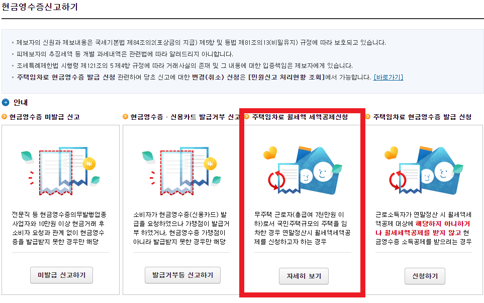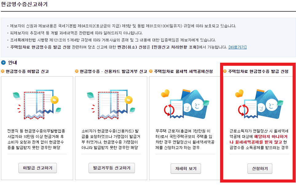 그럼 아래와 같은 페이지가 나오고 가장 오른쪽에 주택임차료 현금영수증 발급 신청을 클릭하시고 임차인 및 임대인 정보 등을 작성하시면 됩니다.