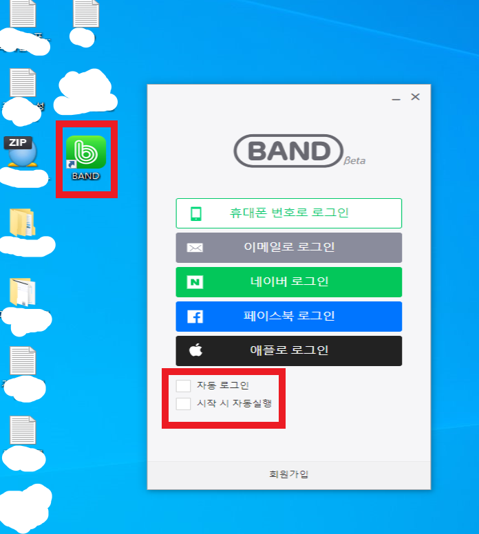 아래와 같이 pc 바탕 화면에 아이콘이 생성되어 있습니다. 네이버 밴드를 자주 이용하시는 분들은 아래 자동 로그인 및 시작 시 자동실행을 선택하시고 로그인을 하시면 됩니다.