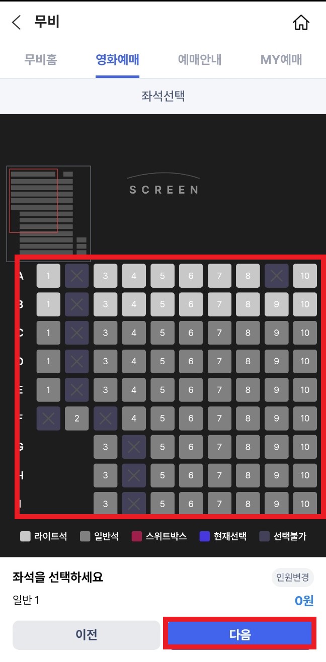 원하시는 영화관 지역, 예약 날짜, 예약 시간, 인원, 좌석을 선택하시고 다음을 클릭해 주세요.
