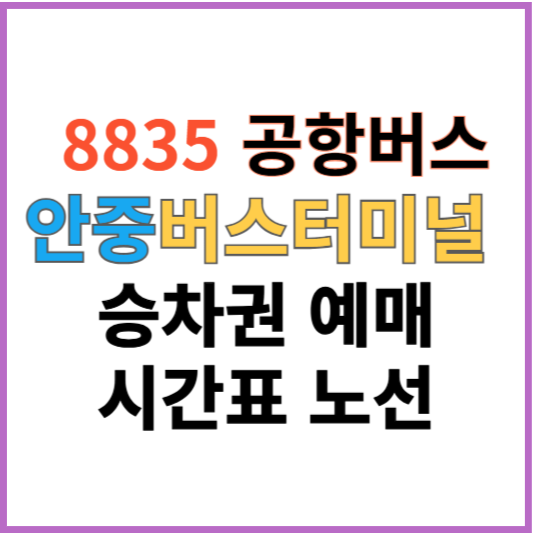 8835 안중 버스터미널 인천공항 공항버스 예매 시간표 정보를 알아보겠습니다. 안중 터미널을 시작으로 향남, 융건릉, 중심상가, 인천공항 방향으로 운행하는 8835번 승차권 예매, 운행시간표, 실시간 버스 위치, 정류장 위치 등을 확인하시고 인천공항 이용 시 참고하시길 바랍니다.
